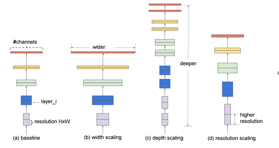 일반적으로 모델을 Scaling하는 방법은 (b)너비, (c)깊이, (d)입력 해상도를 조절하는 것입니다.