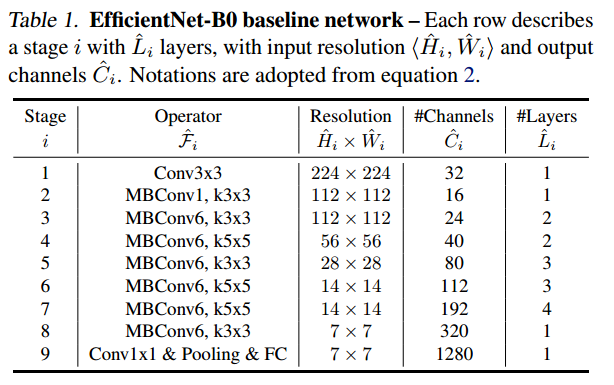 아래는 EfficientNet 구조입니다. MBConv는 MnasNet에서 사용하는 Conv 구조입니다.