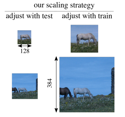코끼리 크기를 동일하게 매칭하려면 어떻게 해야 할까요? train image 해상도를 줄이거나, test image 해상도를 키워야 합니다. 그러면 코끼리 크기가 같아지게 됩니다. 그리고 train dataset 분포와 test dataset 분포의 차이도 compensate됩니다.