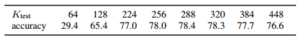 train 입력 이미지가 224일때, test 이미지 크기에 따른 성능 변화입니다.