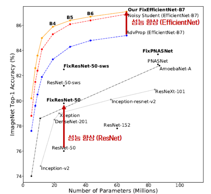 안녕하세요! 이번에 읽어볼 논문은 2020년에 Noisy Student의 성능을 뛰어넘고 SOTA를 달성한 FixEfficientNet, Fixing the train-test resolution 입니다.