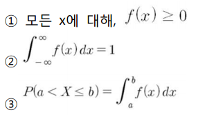 위의 내용을 정리하면 임의의 연속확률변수 $X$의 확률밀도함수 $f(x)$는 다음과 같은 성질을 만족한다는 것을 알 수 있습니다.