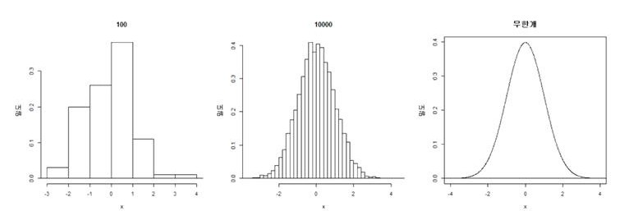 위의 그림 첫 번째와 두 번째 그림은 어떤 모집단에서 표본을 무작위로 100개와 10000개를 추출했을 때 히스토그램을 그린 것입니다. 만약 자료를 계속 추가하면서 계급의 폭을 줄이면 히스토그램은 점점 세밀한 형태를 가지게 되고 결국 세 번째 그림과 같이 모집단의 형태를 나타내는 밀도를 얻게 될 것입니다.