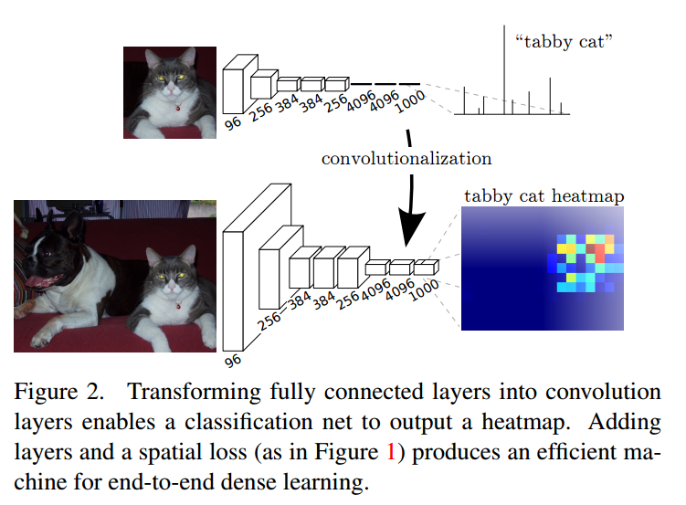 LeNet, AlexNet과 같은 recognition 신경망은 fixed-sized 입력값을 받아서 공간정보가 없는 출력값을 생성합니다. 이러한 신경망의 fully connected layers는 공간 정보를 제거합니다. 하지만 이 fully connected layers는 전체 입력 값을 다루는 kernel을 가진 convolution으로 볼 수 있습니다. 이것을 fully convolutional 신경망으로 전환하면, classification 신경망은 임의의 크기의 입력값을 받아서 heat map을 생성할 수 있습니다.