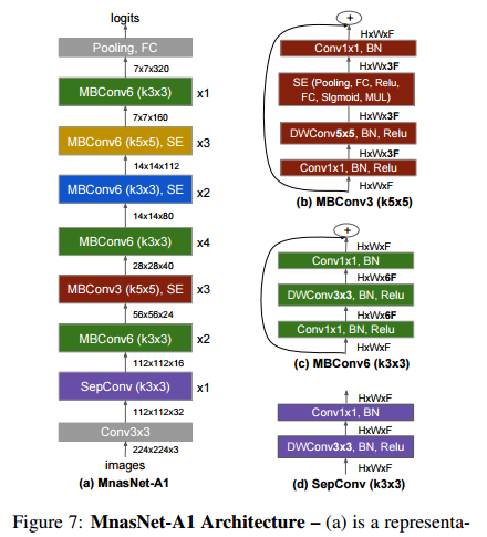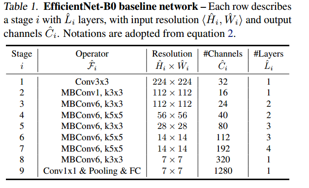 EfficientNet은 강화학습으로 최적의 모델을 찾는 MnasNet의 구조를 사용합니다. MnasNet 구조에서 compound scaling을 적용하여 성능을 끌어올린 것이 EfficientNet입니다. compound scaling은 width, deepth, resolution 3가지 요소의 관계를 수식으로 정의해서 주어진 연산량에 맞게 효율적으로 width, deepth ,resolution를 조절하는 방법입니다. 자세한 논문 리뷰는 아래 포스팅에서 확인하실 수 있습니다.