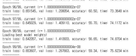 print('train loss: %.6f, val loss: %.6f, accuracy: %.2f, time: %.4f min' %(train_loss, val_loss, 100*val_metric, (time.time()-start_time)/60))