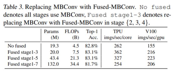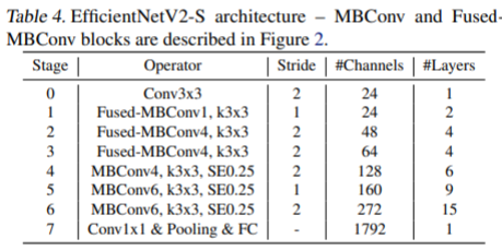 Depthwise convolution은 MobileNetV1와 Xception에서 제안된 방법입니다. 그리고 효과가 입증되어 최신 모델까지 이용하고 있습니다. 이 Depthwise convolution은 conv 연산량을 낮춰주어 제한된 연산량 내에 더 많은 filter를 사용할 수 있는 이점이 있습니다. 하지만 Depthwise convolution은 modern accelerator를 활용하지 못하기 때문에 학습 속도를 느리게 합니다. 따라서 stage 1-3 에서는 MBConv 대신에 Fused-MBConv를 사용합니다. Fused-MBConv는 MBConv의 1x1 conv + 3x3 depthwise conv 대신에, 하나의 3x3conv를 사용하는 것입니다. 모든 stage에 Fused-MBConv를 적용하니 오히려 학습 속도가 느려졌다고 합니다. 따라서 초기의 stage에만 Fused-MBConv를 사용합니다.