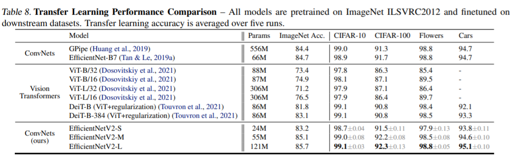 EfficientNetV2는 빠른 학습에 집중한 모델입니다. 데이터셋의 크기가 커질수록 빠른 학습의 중요성도 높아지는데요. 자연어 처리 분야에서 GPT-3은 엄청 큰 데이터셋으로 학습시켜서 뛰어난 성능을 보이고 있습니다. 하지만 GPT-3은 수천개의 TPU로 몇주일간 학습시켰기 때문에 retrain과 개선이 어렵다는 단점이 있습니다. training efficiency는 최근에 큰 관심을 받고 있는데요. 예를 들어, NFNet(2021), BotNet(2021), ResNet-Rs(2021) 등 모두 training efficiency를 향상시키기위해 제안된 모델입니다. 앞에서 설명한 모델들과 EfficientNetV2의 parameters수를 비교했을 때, EfficientNetV2의 parameter수가 월등히 적은데요. 그만큼 효율적인 모델인 것을 강조하고 있네요.