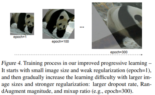 저자는 progressive learning을 적용했을 때, 정확도가 감소하는 이유는 입력 이미지 크기에 따라 동일한 정규화를 사용하기 때문이라고 합니다. 따라서 입력 이미지가 작을 때는 약한 정규화, 입력 이미지가 클 때는 오버 피팅을 방지하기 위해 강한 정규화를 적용합니다. 예를 들어, 입력 이미지가 작으면 augmentation 확률을 낮게 설정하고 입력 이미지가 크면 augmentation 확률을 좀 더 높게 설정하거나 dropout 확률을 높이는 것입니다.