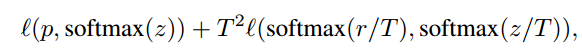 r은 teacher의 출력값, z는 student의 출력값입니다. student의 loss function을 위와 같이 수정합니다. 첫 번째 항은 기존의 loss function이고 두 번째 항이 distillation loss 입니다. T는 하이퍼파라미터 입니다.