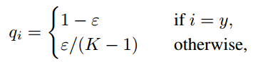 label smoothing은 Inceptionv4에서 제안된 방법입니다. 기존의 true label은 1또는 0으로 설정했습니다. 이렇게 하면 과적합이 발생할 수 있다고 하네요. label smoothing은 classification에서 true label을 1또는 0으로 설정하는 것이 아니라 다음과 같이 설정합니다. 따라서 true label은 0.95 또는 0.005 와 같이 됩니다.