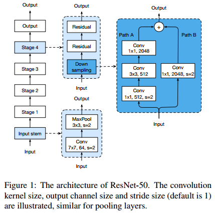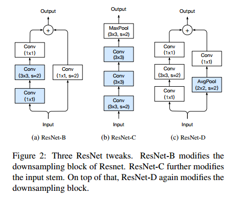 resnet의 초기 레이어에 7x7 conv가 사용하는 것을 확인할 수 있습니다. 이것을 3x3 conv 3개로 대체합니다. 또한, down sample을 진행할 때, residual block과 shortcut connection에서 stride=2인 1x1 conv를 사용합니다. 이것을 residual block에서는 3x3 conv에서 stride=2를 사용하고, shortcut connection에서는 avg pool을 사용하여 다운 샘플링을 진행합니다.