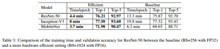 이 표는 BS=256 with FP32와 BS=1024 with FP16을 비교한 표입니다. FP16을 사용했을 때, 정확도가 더 높네요 그리고 학습 속도는 2배 이상 빨라졌습니다.