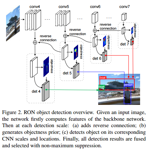 RON은 (1) multi-scale object localization을 위해 reverse connection과 (2) object와 non-object 사이의 불균형을 개선하기 위한 objectness prior을 제안합니다. 즉, object detection의 고질적인 문제인 작은 객체를 탐지하는 것의 어려움을 reverse connection을 통해 해결하고, 소수의 anchor box에만 object가 할당되어 발생하는 positive, negative sample의 불균형 문제를 objectness prior로 해결합니다. 또한 multi-task loss function을 사용하여 1-stage detection을 수행합니다.