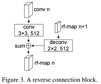 Reverse Connection은 FPN과 작동 방식이 유사합니다. 차이점은 두 가지 입니다. (1) FPN의 top-donw layer에서 수행하는 upsampling 방법을 bilinear에서 deconvolution 으로 사용합니다. (2) FPN의 lateral connection은 차원 감소 목적으로 1x1 conv를 사용했습니다. Reverse Connection은 3x3 conv를 사용합니다.