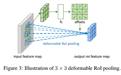 deformable convolution과의 차이점은 offset을 fc layer로 계산한다는 것입니다. 우선 RoI pooling으로 feature map을 생성하고, 여기에 fc layer를 거쳐서 offset을 생성합니다. offset 정보를 활용하여 deformable RoI pooling을 수행해 최종 feature map을 생성합니다.