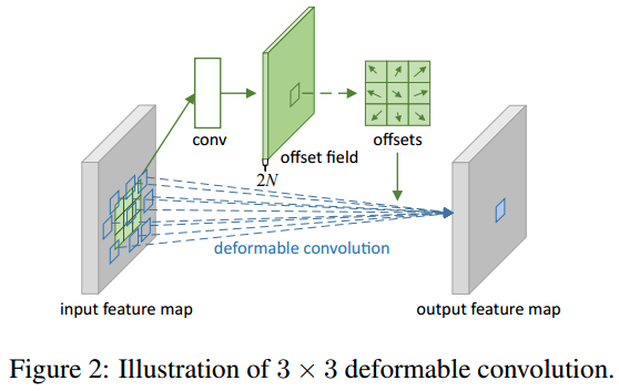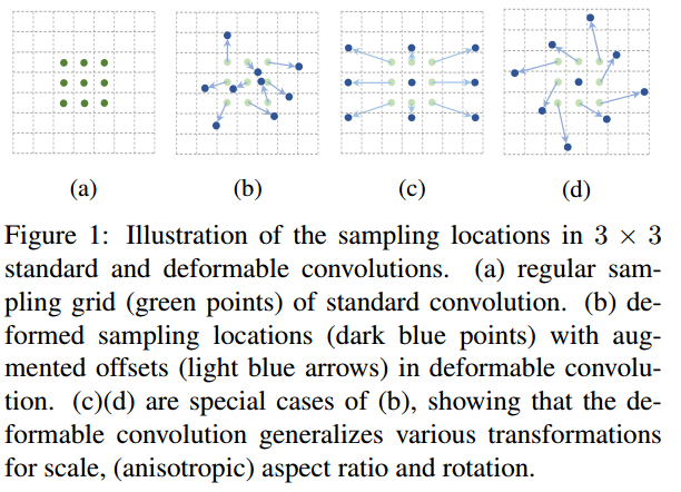 (a)는 기존의 convolution에서 값을 추출하는 영역입니다. (b),(c),(d)는 deformable convolution으로 값을 추출하는 영역입니다. 좀 더 넓은 범위에서 값을 추출하므로 trans variance를 얻습니다.