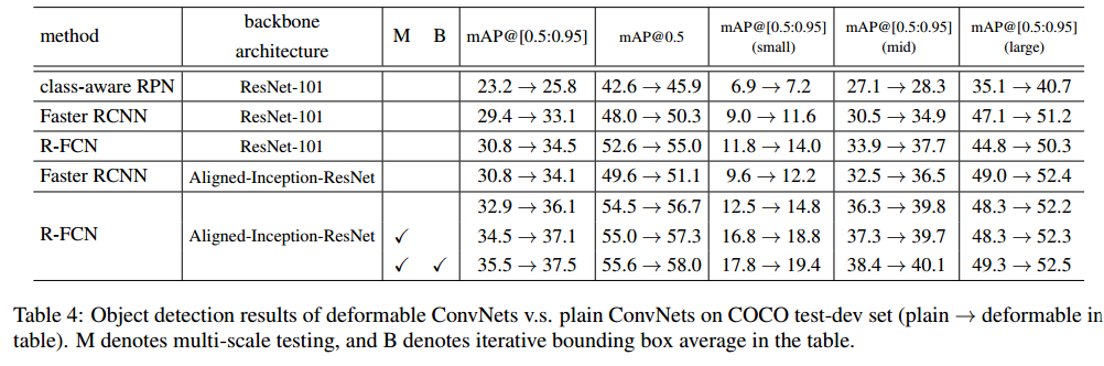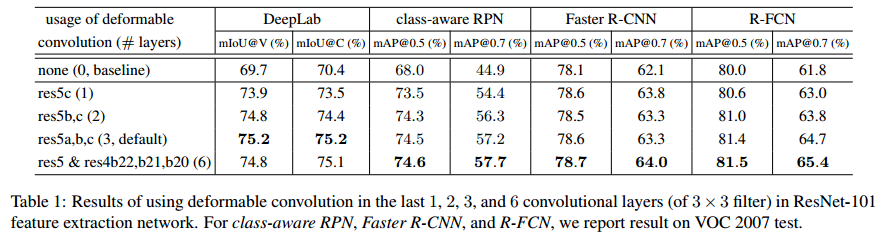 일반적으로 object detection 또는 segmentation은 pre-trained model을 사용합니다. 따라서 모든 layer에 deformable convolution을 사용하는 것이 아니라, 마지막 1~3 layer만 deformable convolution으로 변경하여 전이 학습을 진행합니다.