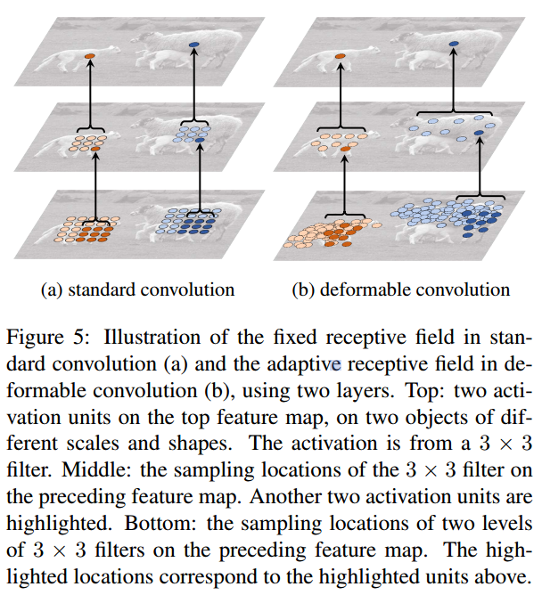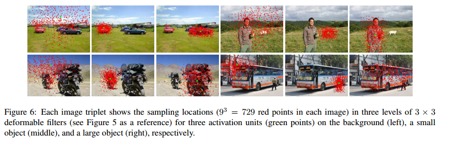 위 그림을 보면 deformable convolution을 적용했을 때, object scale에 따라 receptive field가 다른 것을 확인할 수 있습니다. 반면에 기존의 convolution은 object scale과 관계없이 고정된 영역에서만 특징을 추출합니다.