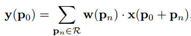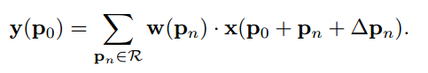 기존의 conv 연산을 살펴보았을 때, 피쳐맵에서 정해진 grid에서만 특징을 추출합니다. 예를 들어, 3x3 filter를 사용하면 3x3 영역에서만 특징을 추출합니다. 그리고 이 값들은 weight와 곱해져 덧셈 연산이 작용됩니다. 수식으로 아래와 같이 표현할 수 있습니다.