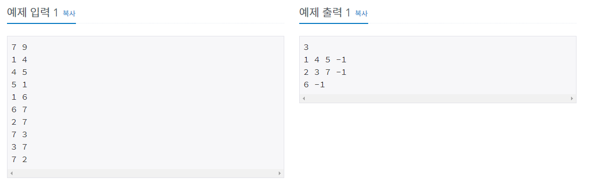 첫째 줄에 두 정수 V(1 ≤ V ≤ 10,000), E(1 ≤ E ≤ 100,000)가 주어진다. 이는 그래프가 V개의 정점과 E개의 간선으로 이루어져 있다는 의미이다. 다음 E개의 줄에는 간선에 대한 정보를 나타내는 두 정