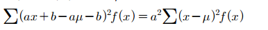 $Y = aX + b$의 분산에 관심을 갖는다고 하겠습니다. $E(X) = \mu_X$라고 하면 다음의 식이 도출됩니다.