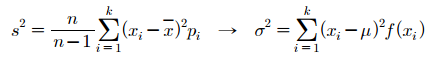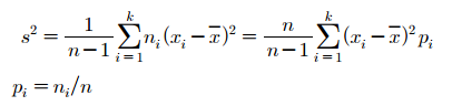 표본크기가 n개가 있고 자료가 k개가 있어 이들 값을 $x_1, ... , x_2$라고 하겠습니다. $n_i$는 표본 중 $x_i$값을 가지는 표본수라고 하겠습니다. 값이 중복되는 자료가 있기 때문에 n > k 입니다. 이런 경우에 표본분산은 다음과 같이 도출됩니다.