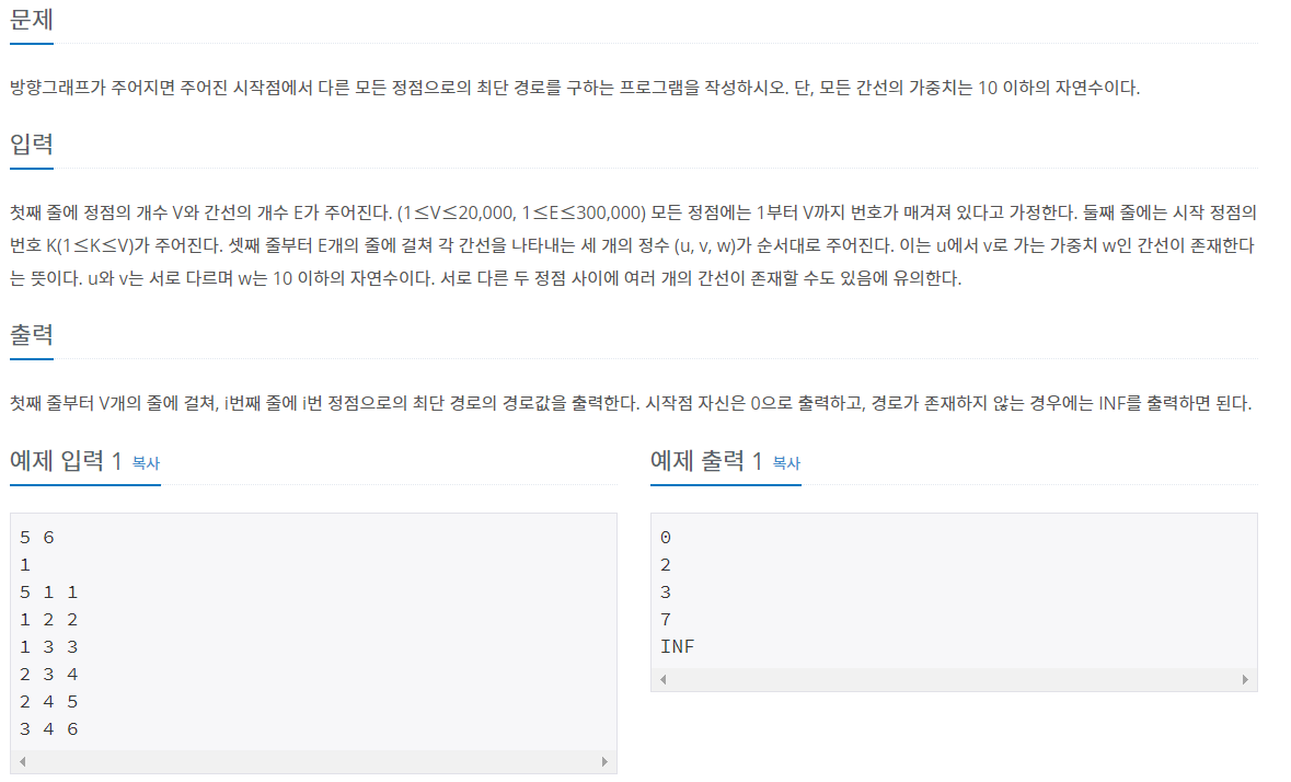 첫째 줄에 정점의 개수 V와 간선의 개수 E가 주어진다. (1≤V≤20,000, 1≤E≤300,000) 모든 정점에는 1부터 V까지 번호가 매겨져 있다고 가정한다. 둘째 줄에는 시작 정점의 번호 K(1≤K≤V)가 주어진다.
