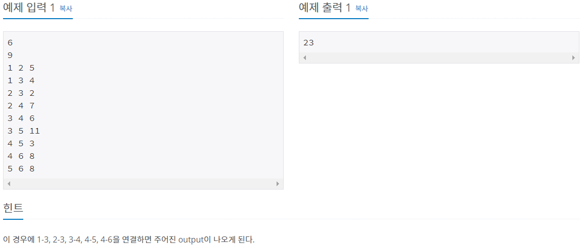 크루스컬 알고리즘으로 주어진 그래프를 MST로 만듭니다. MST의 총 가중치를 출력합니다.