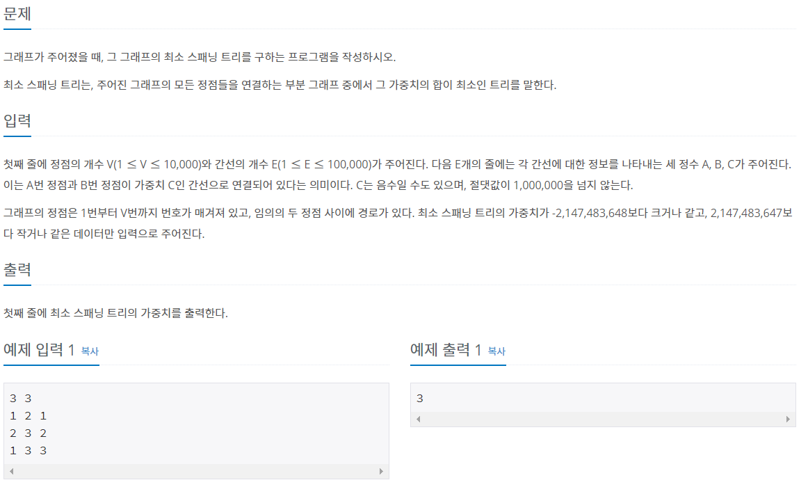 첫째 줄에 정점의 개수 V(1 ≤ V ≤ 10,000)와 간선의 개수 E(1 ≤ E ≤ 100,000)가 주어진다. 다음 E개의 줄에는 각 간선에 대한 정보를 나타내는 세 정수 A, B, C가 주어진다. 이는 A번 정점과 B번 정점이