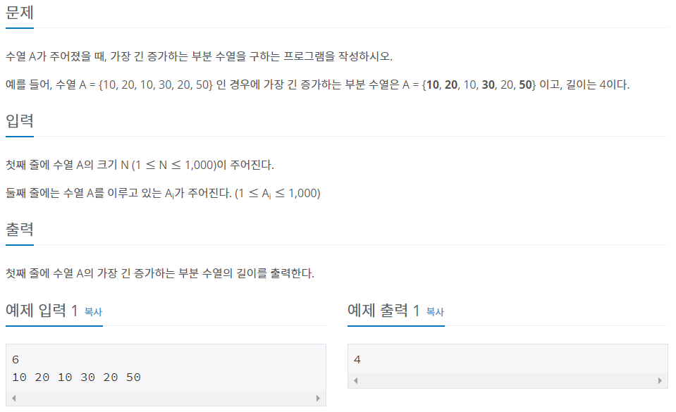 수열 A가 주어졌을 때, 가장 긴 증가하는 부분 수열을 구하는 프로그램을 작성하시오. 예를 들어, 수열 A = {10, 20, 10, 30, 20, 50} 인 경우에 가장 긴 증가하는 부분 수열은 A = {10, 20, 10, 30, 20, 50} 이