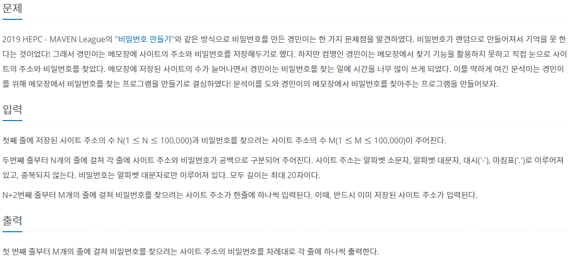 첫째 줄에 저장된 사이트 주소의 수 N(1 ≤ N ≤ 100,000)과 비밀번호를 찾으려는 사이트 주소의 수 M(1 ≤ M ≤ 100,000)이 주어진다. 두번째 줄부터 N개의 줄에 걸쳐 각 줄에 사이트 주소와 비밀번