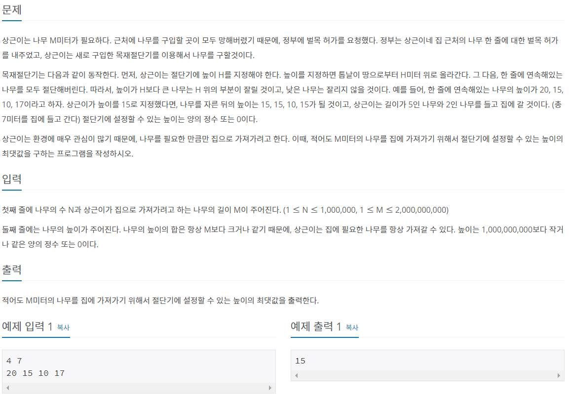 첫째 줄에 나무의 수 N과 상근이가 집으로 가져가려고 하는 나무의 길이 M이 주어진다. (1 ≤ N ≤ 1,000,000, 1 ≤ M ≤ 2,000,000,000) 둘째 줄에는 나무의 높이가 주어진다. 나무의 높이의 합은 항상 M보
