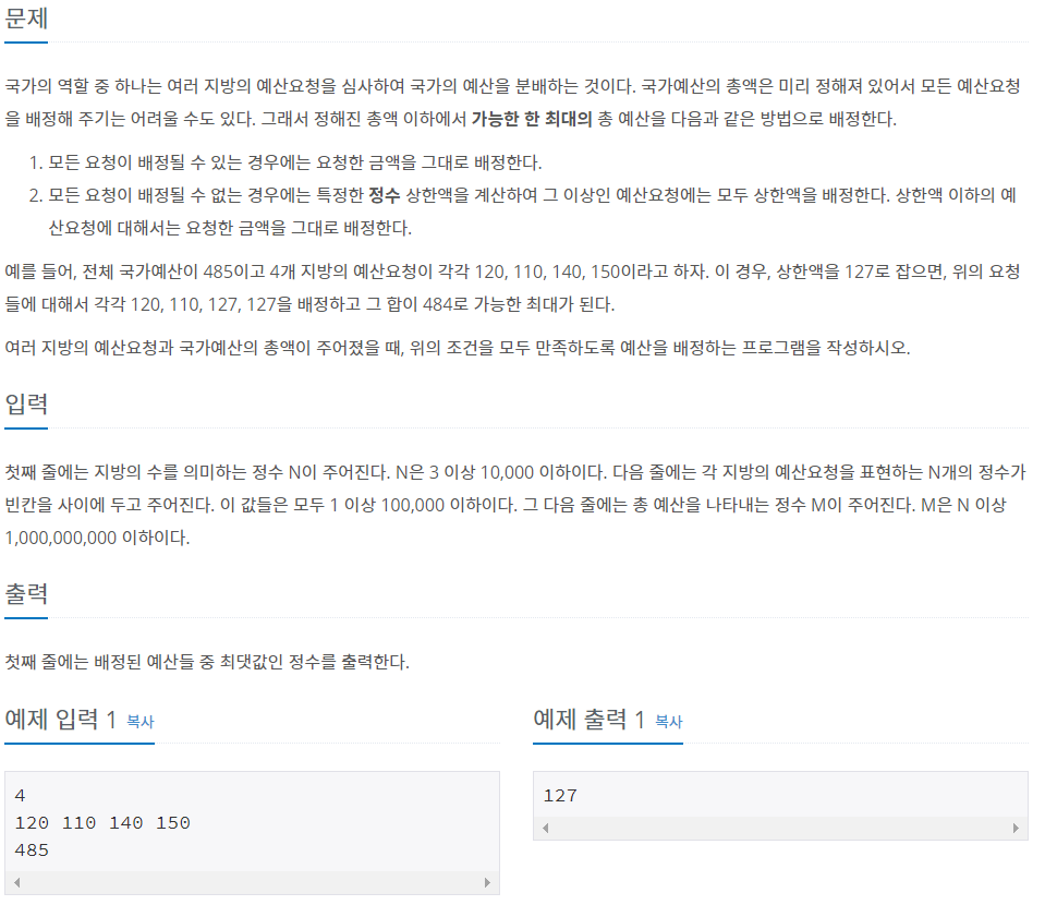 첫째 줄에는 지방의 수를 의미하는 정수 N이 주어진다. N은 3 이상 10,000 이하이다. 다음 줄에는 각 지방의 예산요청을 표현하는 N개의 정수가 빈칸을 사이에 두고 주어진다. 이 값들은 모두 1 이상