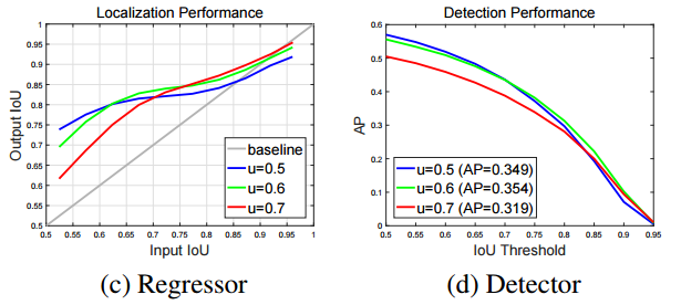 Object Detection을 수행할 때, IoU는 RPN에서 생성한 region proposals가 positive인지 negative인지 결정하는 하이퍼 파라미터로 이용합니다. 일반적으로 낮은 IoU를 설정하면 detection 바운딩 박스 위치 결과값이 부정확하고, 높은 IoU를 설정하면, 바운딩 박스 위치 결과값이 정확한 대신에 detection의 전체 성능이 감소합니다.(많은 proposals를 검출하지 못하기 때문에, recall이 감소해 AP가 감소합니다.) 이처럼 IoU는 detection의 성능에 큰 영향을 미칩니다.