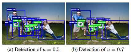 Object Detection을 수행할 때, IoU는 RPN에서 생성한 region proposals가 positive인지 negative인지 결정하는 하이퍼 파라미터로 이용합니다. 일반적으로 낮은 IoU를 설정하면 detection 바운딩 박스 위치 결과값이 부정확하고, 높은 IoU를 설정하면, 바운딩 박스 위치 결과값이 정확한 대신에 detection의 전체 성능이 감소합니다.(많은 proposals를 검출하지 못하기 때문에, recall이 감소해 AP가 감소합니다.) 이처럼 IoU는 detection의 성능에 큰 영향을 미칩니다.