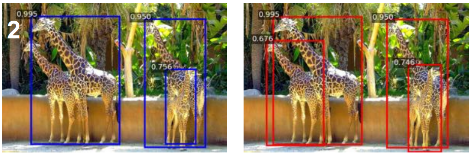 왼쪽 그림을 보면 얼룩말이 두 마리 존재하지만, NMS 알고리즘에 의해서 하나의 얼룩말만 검출되었습니다. 반면에 Soft-NMS는 얼룩말 두마리를 잘 검출합니다.