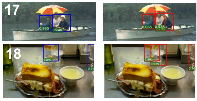 Soft-NMS는 바운딩 박스를 억제하는 것이 아니라, confidence를 감소시킵니다. 기존의 NMS에서 억제되었던 바운딩 박스가 Soft-NMS를 적용하면 낮은 confidence로 검출되는 것입니다.