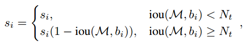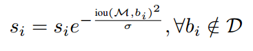 위 함수는 기존 NMS 함수입니다. M은 해당 클래스에서 confidence가 가장 높은 바운딩박스를 의미하며, bi는 동일한 클래스내의 박스를 의미합니다. M과 bi의 iou가 일정 값(Nt) 이상이면 0으로 억제됩니다.