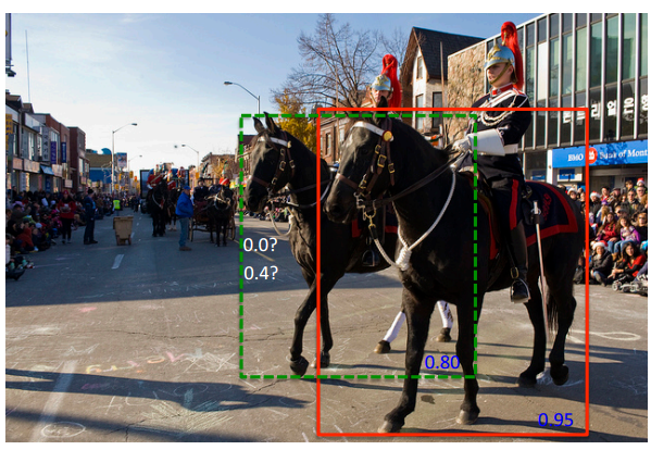 위 그림을 보면, 초록색 바운딩 박스는 NMS에 의해 억제되어야 하지만, Soft-NMS는 낮은 confidence를 부여합니다. 기존의 confidence가 0.8인데, 0.4로 감소하여 표현하는 것입니다.