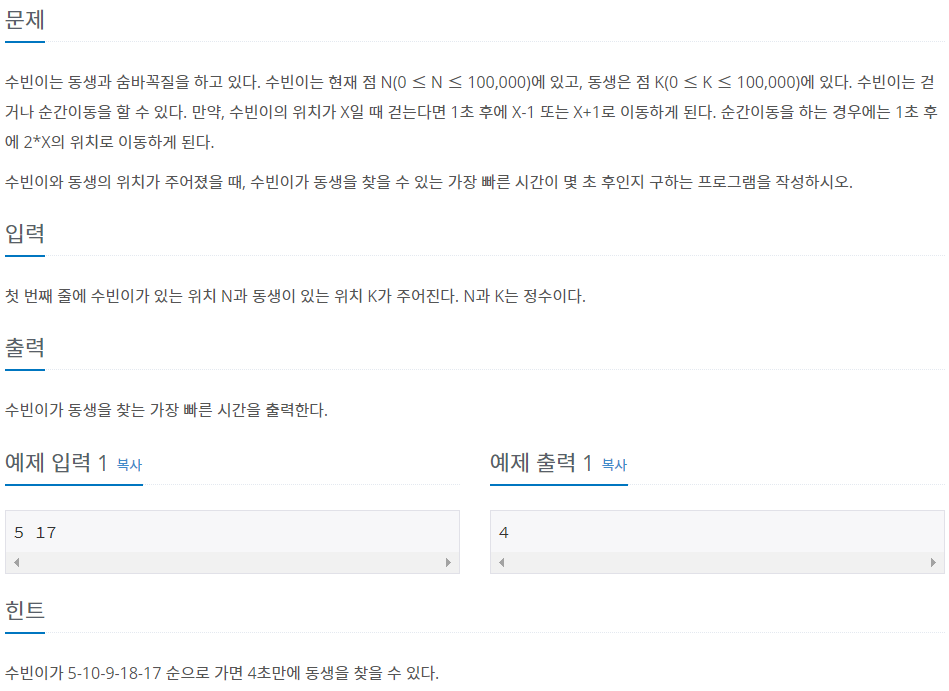 수빈이는 동생과 숨바꼭질을 하고 있다. 수빈이는 현재 점 N(0 ≤ N ≤ 100,000)에 있고, 동생은 점 K(0 ≤ K ≤ 100,000)에 있다. 수빈이는 걷거나 순간이동을 할 수 있다. 만약, 수빈이의 위치가 X일