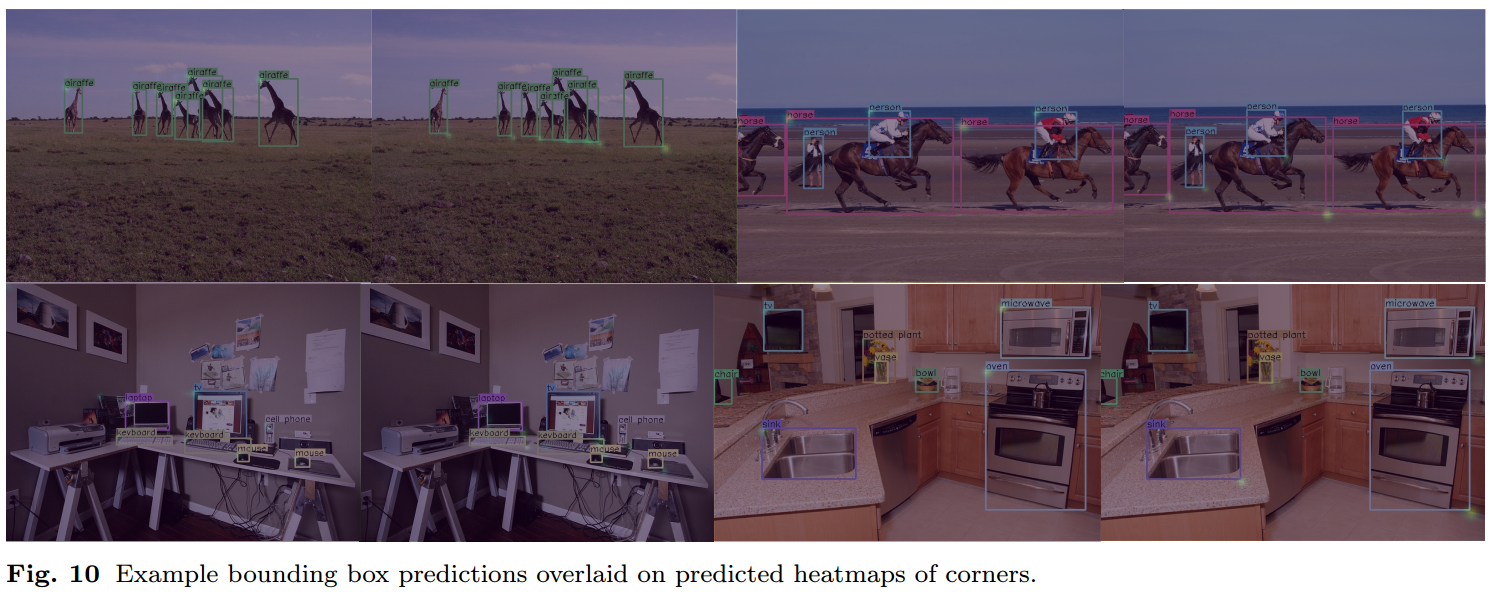 CornerNet은 두 쌍의 특징점(keypoints)를 사용하여 객체의 바운딩 박스를 예측하는 모델입니다. 두 쌍의 특징점은 좌촉 상단 모서리, 우측 하단 모서리를 의미합니다. 특징점을 기반으로 바운딩 박스를 생성하기 때문에 앵커 박스를 사용할 필요가 없습니다. 앵커 박스가 없는 detection 모델이라니..!! 신기하네요. ㅎㅎ CornerNet은 앵커박스를 사용하지 않고도 다른 모델을 뛰어넘는 성능을 보여줍니다.