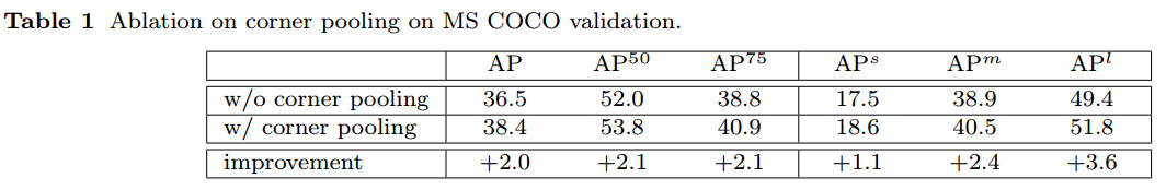 corner pooling 사용 유무에 대한 성능 비교입니다.