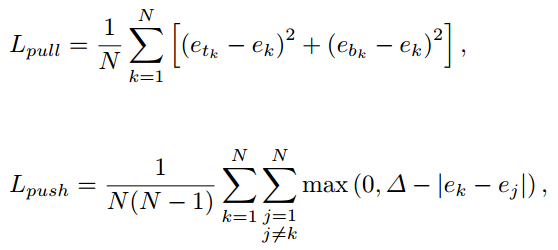 동일한 그룹에 속하는 특징점에 대해 pull loss, 다른 그룹에 속하는 특징점은 push loss를 사용합니다.