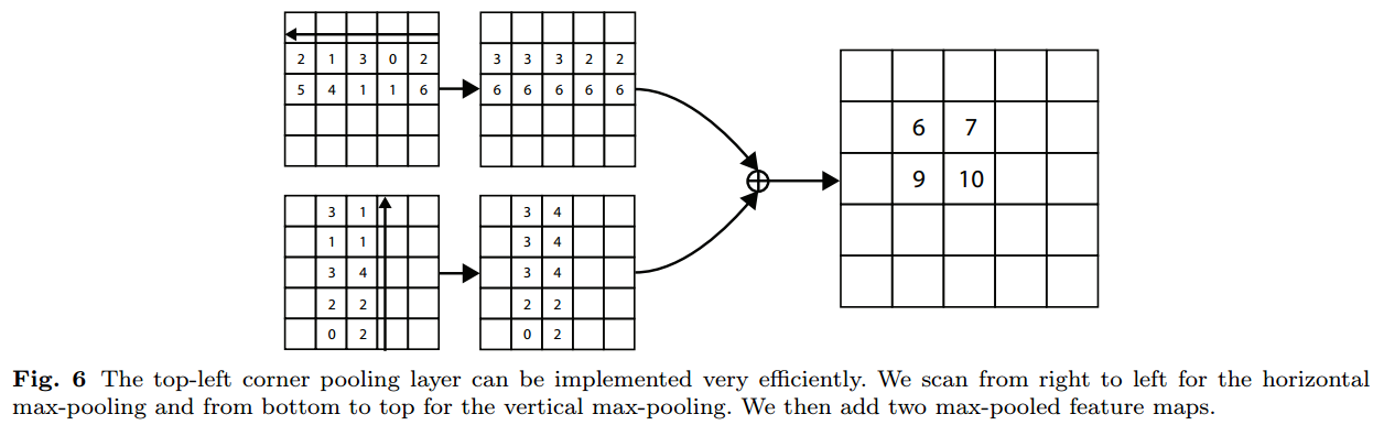 corner pooling은 어느 pixel이 특징점인지 식별하기 위해 사용하는데, max pooling 연산을 기반으로 합니다. 아래 그림을 보면 corner pooling의 작동 원리에 대해 이해할 수 있습니다.