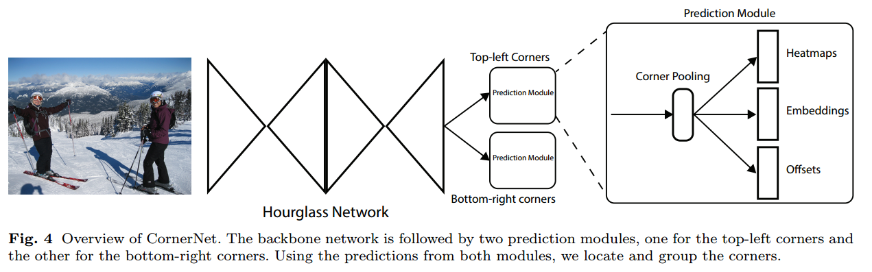 특징점을 검출하기 위해 pose estimation에서 사용하는 hourglass를 backbone으로 사용합니다. hourglass의 출력값에 좌측 상단 특징점과 우측 하단 특징점을 검출하는 두 개의 모듈을 적용합니다. 각 모듈은 corner pooling 과정을 거쳐 heatmap, embedding, offset을 예측합니다. 즉, CornerNet은 hourglass와 두 개의 모듈로 구성되어 있다고 생각할 수 있습니다.