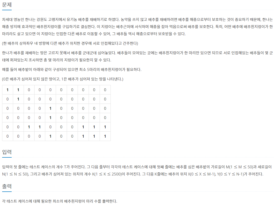 if graph[i][j] == 1: # 배추가 존재하는 경우