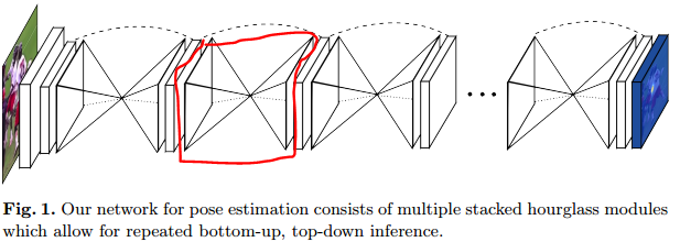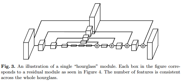 위 그림은 hourglass module입니다. 하나의 block은 residual unit을 의미합니다. 입력값이 최소 resolution을 갖도록 residual unit을 통한 down sample을 거칩니다. 최소 resolution에 도달한 뒤에 biliear upsample 방식으로 원래 입력값 크기로 복원합니다. 또한 동일한 크기의 resolution 끼리 element-wise addition 연산을 수행합니다.