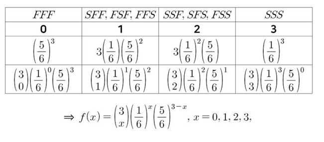 주사위를 세 번 던져 1이 나온 횟수를 $X$라고 하겠습니다. 1이면 $S$, 아니면 $F$로 표기하겠습니다.