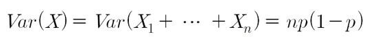 베르누이확률변수는 서로 독립이기 때문에 $X$의 분산도 다음과 같이 각각의 베르누이 분산의 합으로 표시합니다.